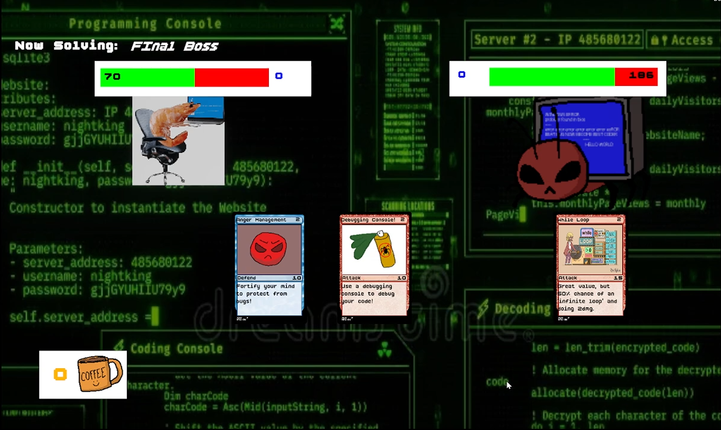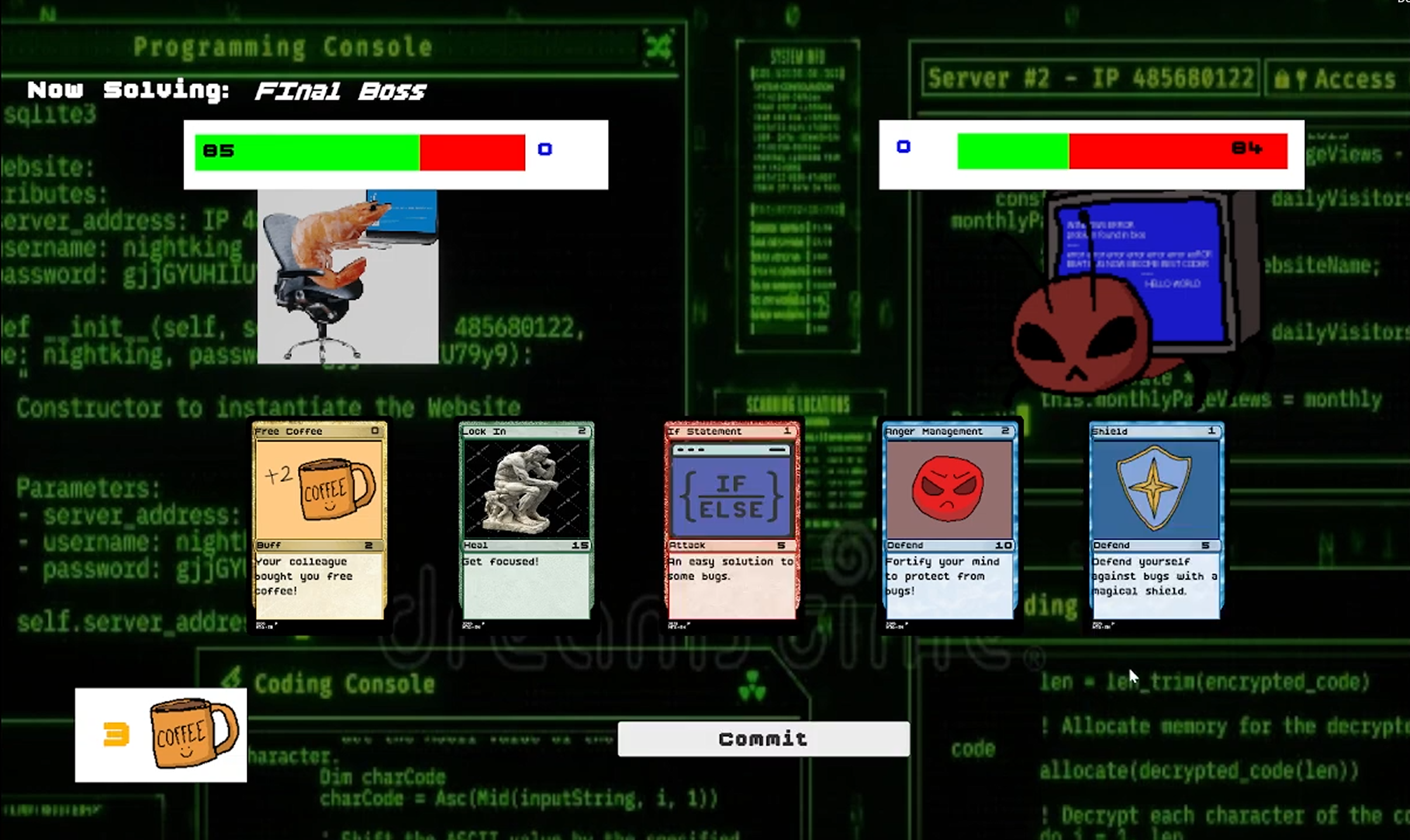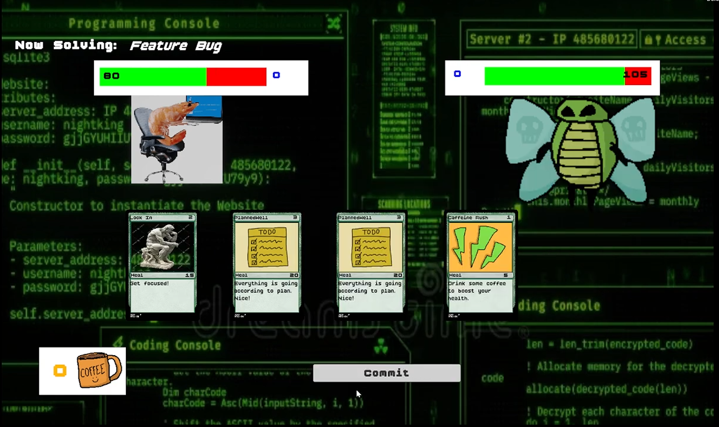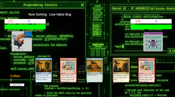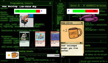 A card game where you work as a programmer to defeat bugs in your code! Go through the 3 big bug enemies (increasing in difficulty and intelligence!) and manage your way to the end of the game through 2 randomised events. Made in +- 3 weeks for a school project. All the code and art is made by me unless otherwise stated.